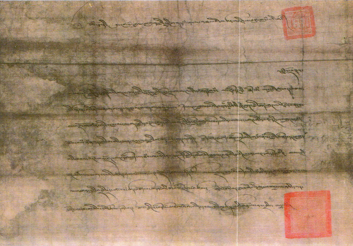 འཛམ་བུ་བྲཀྴས་མཚན་པའི་གླིང་དུ་གྱུར་པའི་གངས་ཅན་གྱི་ལྗོངས་སྤྱི་དང་བྱེ་བྲག་མངའ་རིས་སྐོར་གསུམ། ལ་སྟོད་དིང་རི། སྙེ་ནམ། ལ་ཕྱི་ཆུ་བར་བཅས་ཀྱི་ལྷ་སྡེ་མི་སྡེ་ཡོན་བདག་དད་ལྡན་མཐའ་དག་ལ་བཟློ་བ། དེ་ཡང་རྒྱལ་བའི་བསྟན་པ་རིན་པོ་ཆེའི་རིང་ལུགས་ཀྱི་སྒོར་ཞུགས་པའི་རྗེ་དབོན་བླ་མ་འགྲོ་མགོན་འདི་པ་རྒྱལ་བ་གར་གྱི་དབང་པོ་བརྒྱད་པའི་ཡབ་ཀྱི་སྐུ་སྐྱེ་འཁྲུལ་མེད་ཡིན་པ་ལས་གང་གི་དབོན་རིགས་སུ་འཁྲུངས་ཤིང་ཐོས་བསམ་རྣམ་དཀར་བགྱི་བ་མི་དམན་པས་ཀུན་གྱི་མཆོད་འོས་སུ་གྱུར་པ་འདིར། ཁྱེད་གོང་འཁོད་ལྷ་འདྲེ་མི་གསུམ་རྣམས་ཀྱིས་རྙེད་དང་བཀུར་བའི་ཞབས་ཏོག་ཕན་གྲོགས་ཡང་བྱེད་པ་རྣམས་ལ་འདི་ནས་ཀྱང་འདི་ཕྱི་དགེ་བའི་སྐྱབས་འཇུག་གི་དམིགས་འདུན་ཡང་དག་བྱེད་ཅིང་། གལ་སྲིད་གོང་ཚིག་ལས་འདས་པའི་གནོད་པ་འགལ་ལོག་པར་འགྲོ་བ་བྱས་པ་ཤར་ཚེ། ལས་འབྲས་བསླུ་བ་མེད་པའི་རྣམ་སྨིན་དང་བཀའ་བསྲུང་ཕོ་ཉ་ལས་མཁན་གྱི་འཕྲིན་ལས་དྲག་པོས་ཚར་གཅོད་པ་གདོན་མི་ཟ་བས་ངེས་པར་འཚལ། ཞེས་གོ་བར་བྱ་བའི་ཡི་གེ་ཆུ་ཕག་རྒྱལ་ཉའི་དཀར་ཕྱོགས་རྒྱལ་བ་གཉིས་པའི་ཚེས་དགེ་བར། ཆོས་དབྱིངས་བདེ་བ་ཆེན་པོ་འོག་མིན་དཔལ་གྱི་མཚུར་ཕུའི་གནྔྷོ་ལ་ནས་བྲིས། མདྒལཾ།།